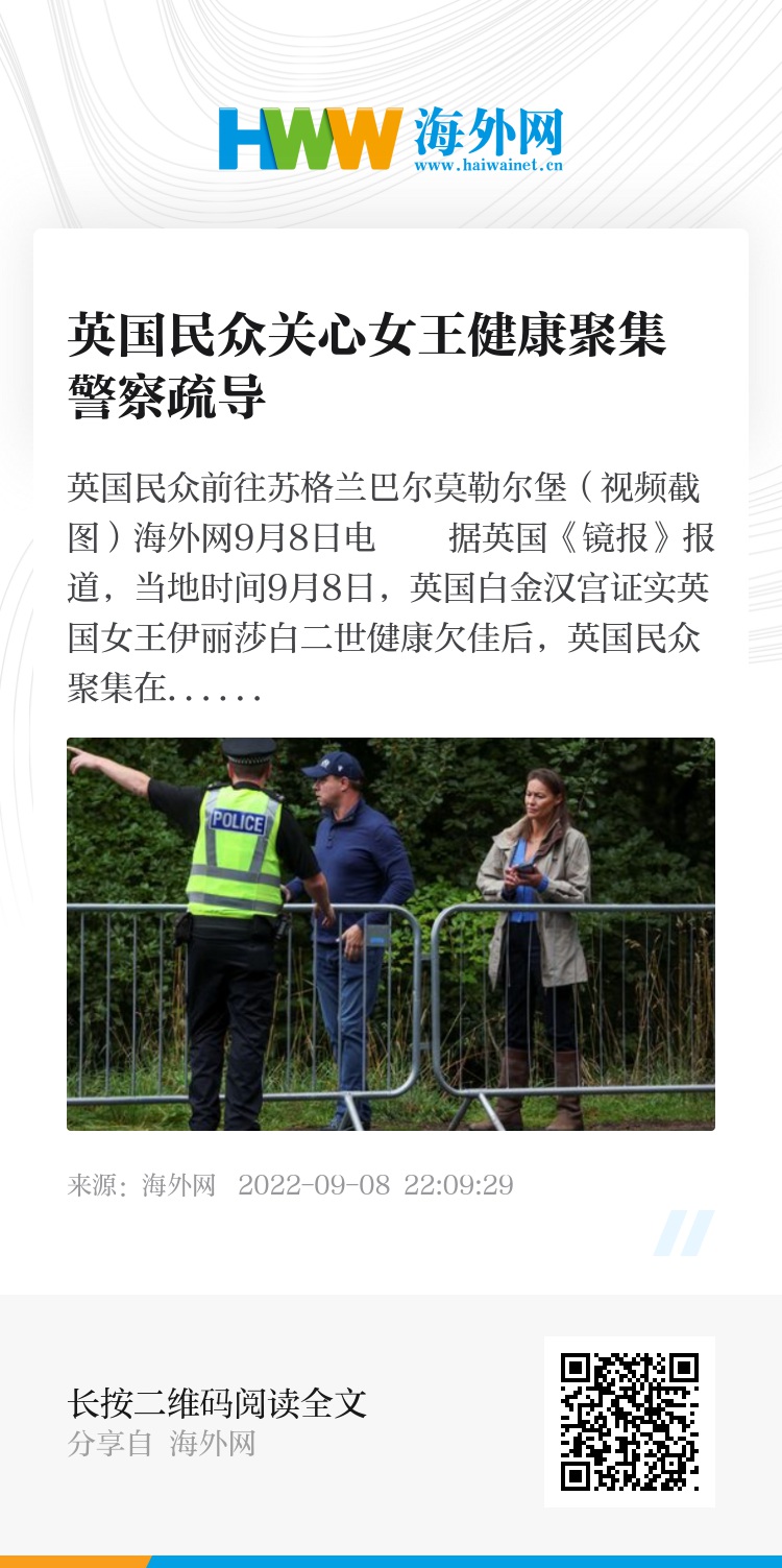 海外网9月8日电 据英国《镜报》报道,当地时间9月8日,英国白金汉宫证实英国女王伊丽莎白二世健康欠佳后,英国民众聚集在在苏格兰巴尔莫勒尔堡外。