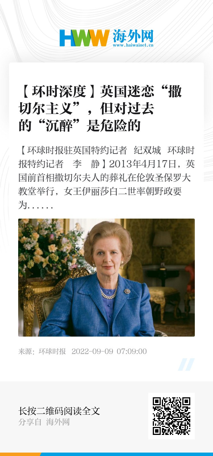 虽然英国很多政治人士都迷恋“撒切尔主义”,但这位前首相对日前保守党党首竞选的影响之大,已经有一段时间没有出现过了。在一些人看来,撒切尔夫人在此次英国首相竞选中的“广泛存在”,主要是因为英国现在面临和她执政时期类似的经济环境:通胀高企、能源危机加剧、工会罢工以及基层民众呼吁政府提供更多财政援助的声音此起彼伏。还有观点认为,撒切尔夫人执政时美苏争霸,她与美国时任总统合作对抗苏联的行动,一定程度上也和目前英国和美国合作对抗俄罗斯类似。