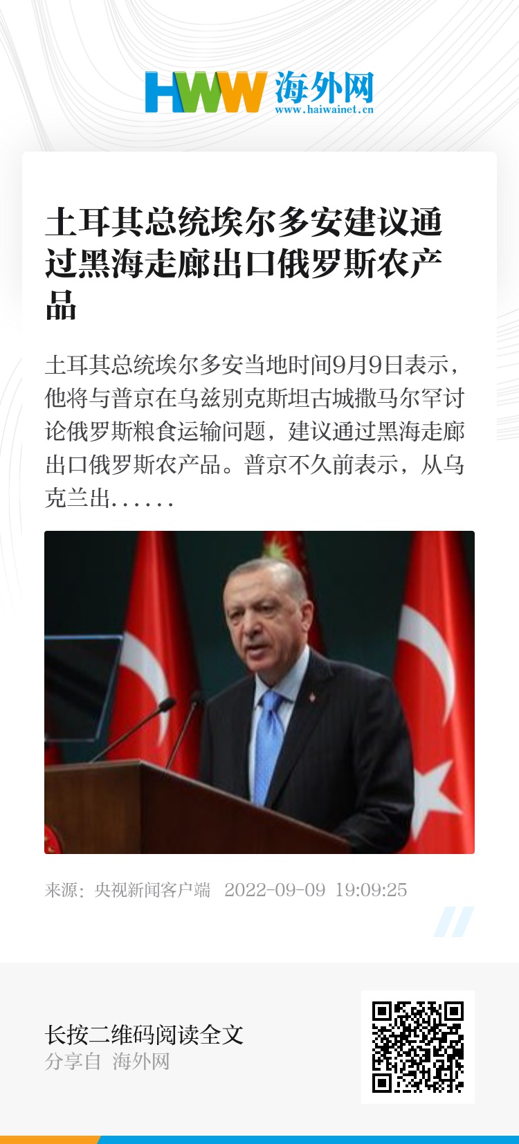 土耳其总统埃尔多安当地时间9月9日表示,他将与普京在乌兹别克斯坦古城撒马尔罕讨论俄罗斯粮食运输问题,建议通过黑海走廊出口俄罗斯农产品。