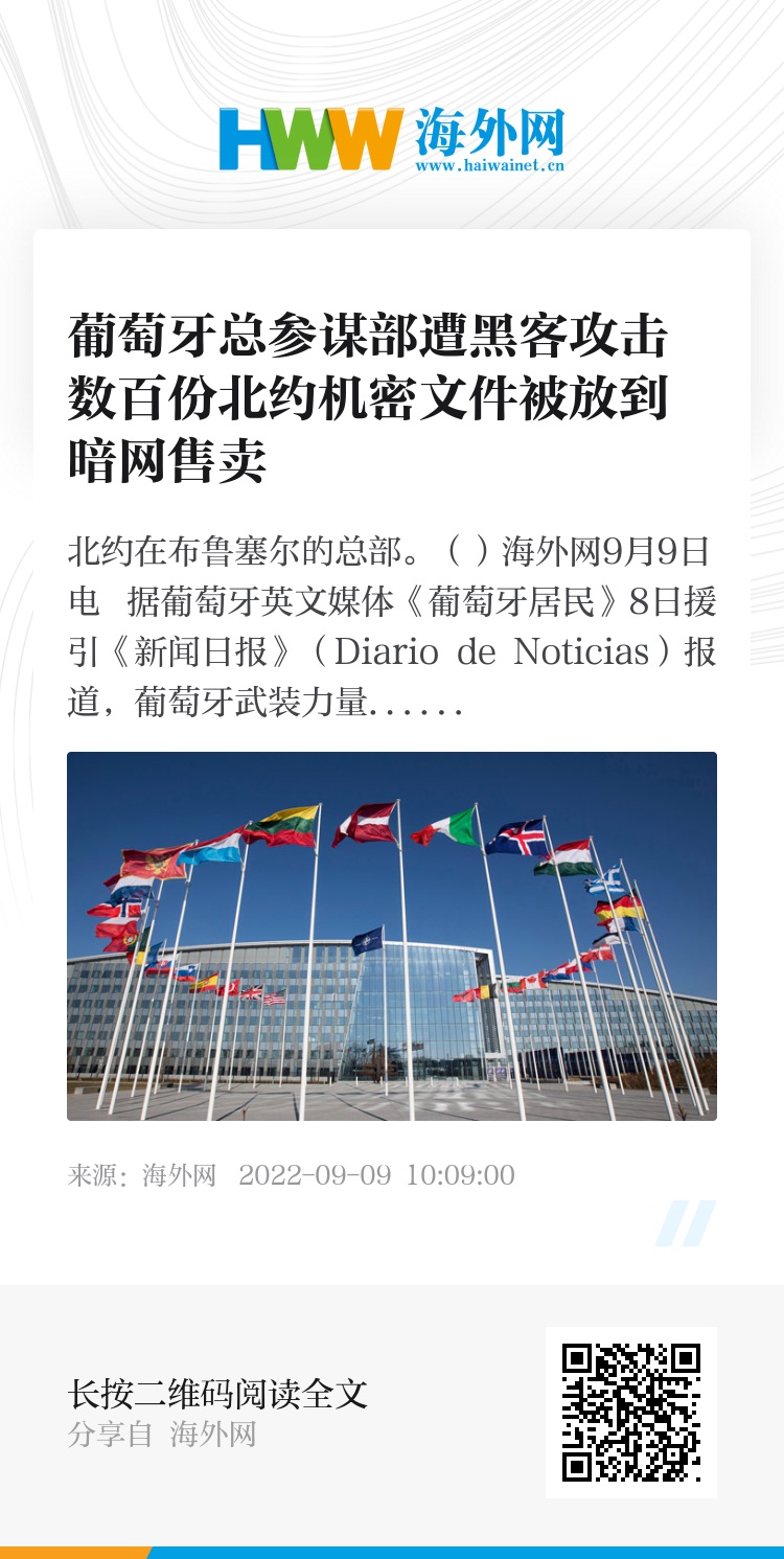 海外网9月9日电 据葡萄牙英文媒体《葡萄牙居民》8日援引《新闻日报》(Diario de Noticias)报道,葡萄牙武装力量总参谋部遭到史无前例地黑客攻击,导致几百份北约机密文件被放到暗网售卖。