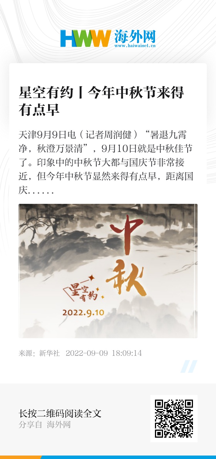 新华社天津9月9日电(记者周润健)“暑退九霄净,秋澄万景清”,9月10日就是中秋佳节了。印象中的中秋节大都与国庆节非常接近,但今年中秋节显然来得有点早,距离国庆节还有20天。天文科普专家表示,今年中秋节是2015年至2032年这18年中最早的,属“早中秋”。