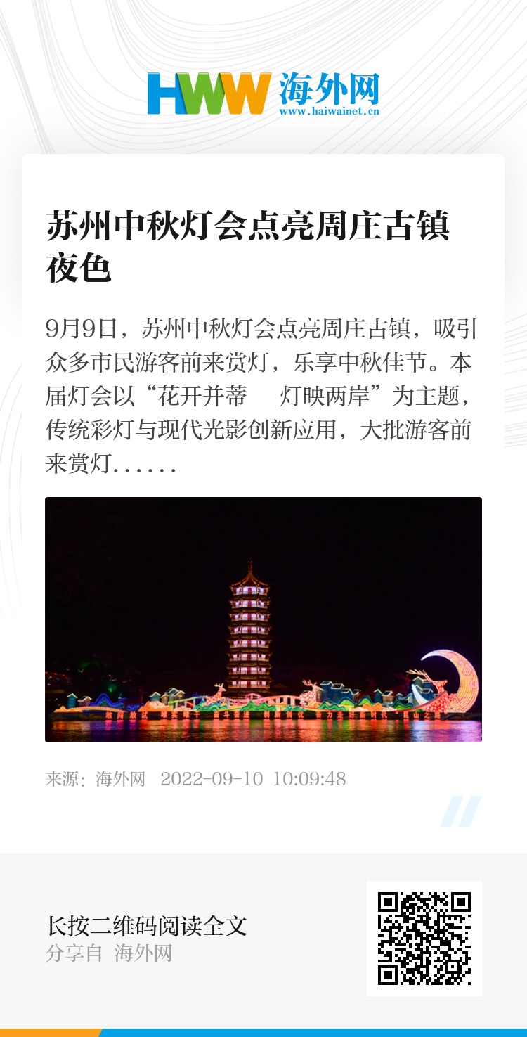 9月9日,苏州中秋灯会点亮周庄古镇,吸引众多市民游客前来赏灯,乐享中秋佳节。本届灯会以“花开并蒂 灯映两岸”为主题,传统彩灯与现代光影创新应用,大批游客前来赏灯观景,感受传统中秋佳节的浓郁氛围。图片来源:管钰楠/视觉中国
