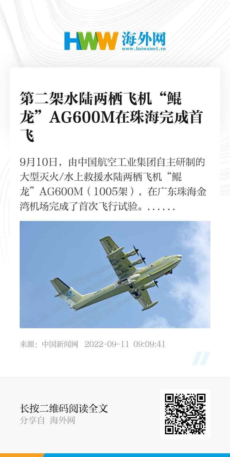 32484256,.第二架水陆两栖飞机“鲲龙”AG600M在珠海完成首飞,.2022-09-11 09:33:41,.103712,.夏丽娟