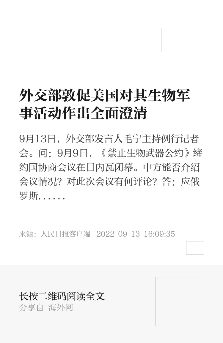 美国是世界上生物军事活动最多的国家,也是唯一拒绝谈判《禁止生物武器公约》核查议定书的国家,国际社会对此早有关切。中方支持按照《公约》规定,以客观、公正的态度,对美国遵约相关问题继续开展审议。我们也再次敦促美国对其生物军事活动作出全面澄清,并停止独家阻挠重启核查议定书谈判,给国际社会一个负责任的交代。(人民日报客户端 李欣怡)