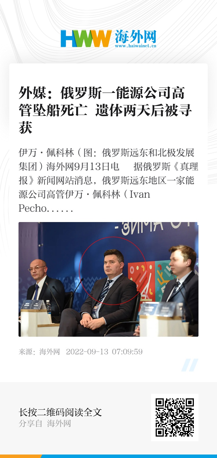 海外网9月13日电 据俄罗斯《真理报》新闻网站消息,俄罗斯远东地区一家能源公司高管伊万·佩科林(Ivan Pechorin)在符拉迪沃斯托克市罗斯基岛附近海域乘船时,坠船身亡。