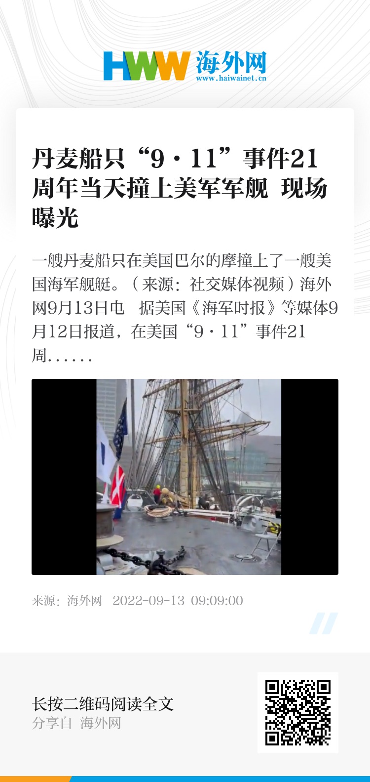 海外网9月13日电 据美国《海军时报》等媒体9月12日报道,在美国“9·11”事件21周年当天,一艘丹麦船只在美国巴尔的摩内港撞上了一艘美国海军舰艇。
