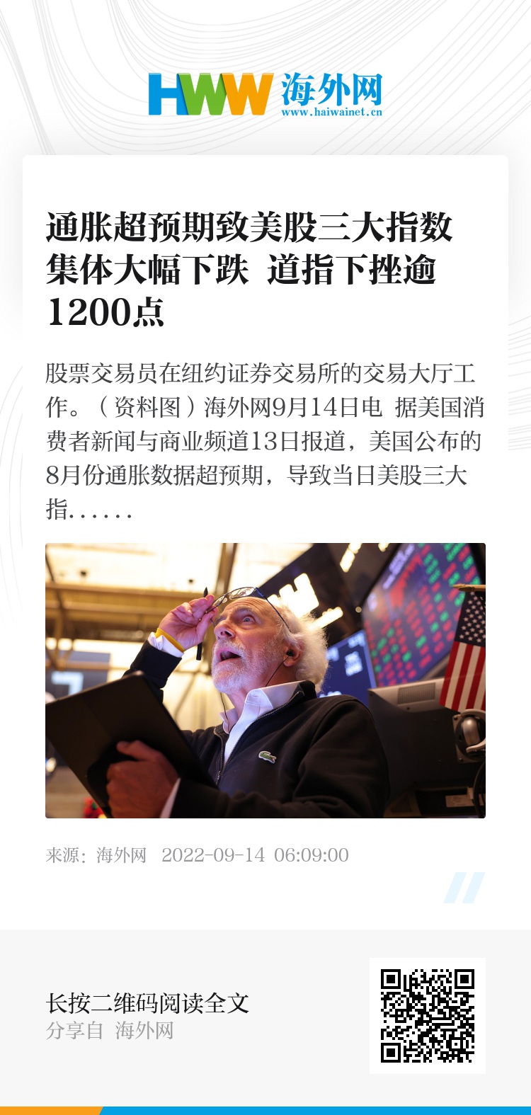 海外网9月14日电 据美国消费者新闻与商业频道13日报道,美国公布的8月份通胀数据超预期,导致当日美股三大指数集体大幅下跌。