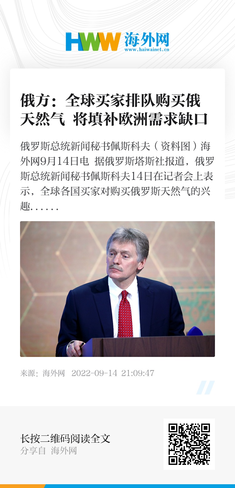 海外网9月14日电 据俄罗斯塔斯社报道,俄罗斯总统新闻秘书佩斯科夫14日在记者会上表示,全球各国买家对购买俄罗斯天然气的兴趣激增,这将填补欧元区国家需求下降留下的缺口。