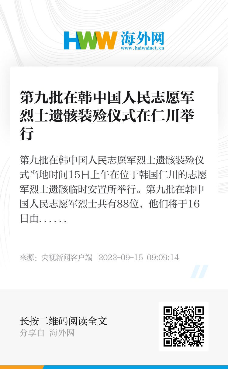第九批在韩中国人民志愿军烈士遗骸装殓仪式当地时间15日上午在位于韩国仁川的志愿军烈士遗骸临时安置所举行。第九批在韩中国人民志愿军烈士共有88位,他们将于16日由中国人民解放军空军运输机运-20接运回国。
