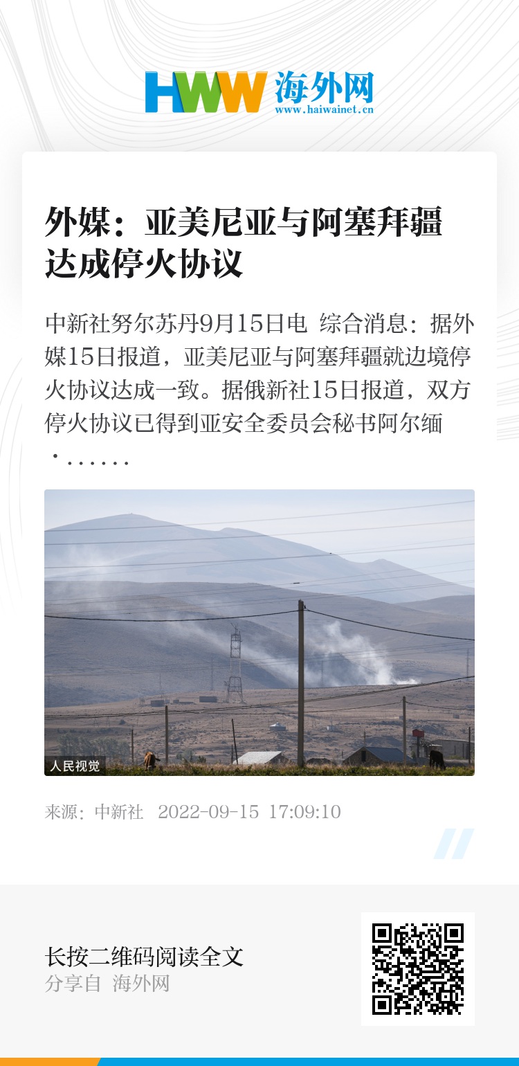 中新社努尔苏丹9月15日电 综合消息:据外媒15日报道,亚美尼亚与阿塞拜疆就边境停火协议达成一致。