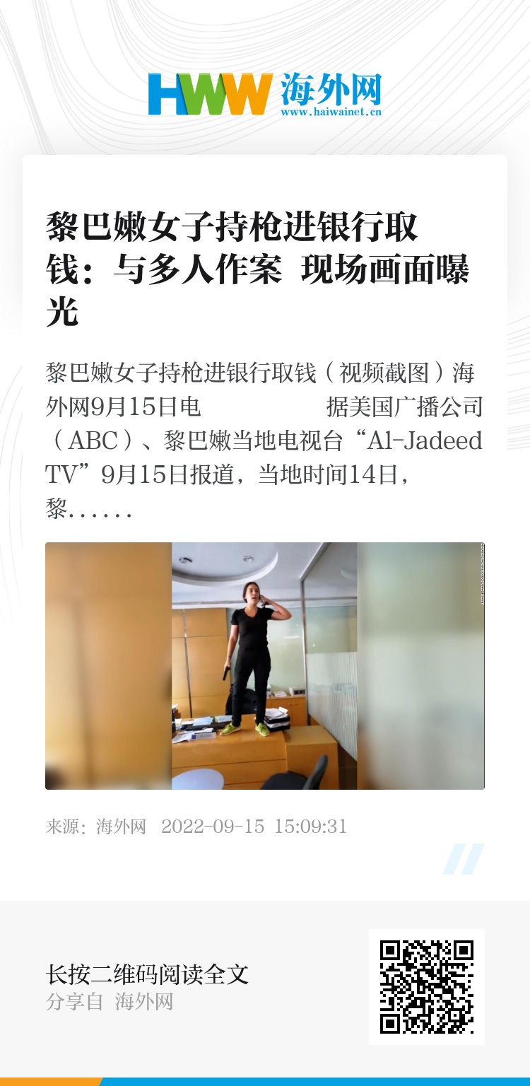 海外网9月15日电 据美国广播公司(ABC)、黎巴嫩当地电视台“Al-Jadeed TV”9月15日报道,当地时间14日,黎巴嫩一名女子持枪闯入银行,取出了自己在银行的存款。