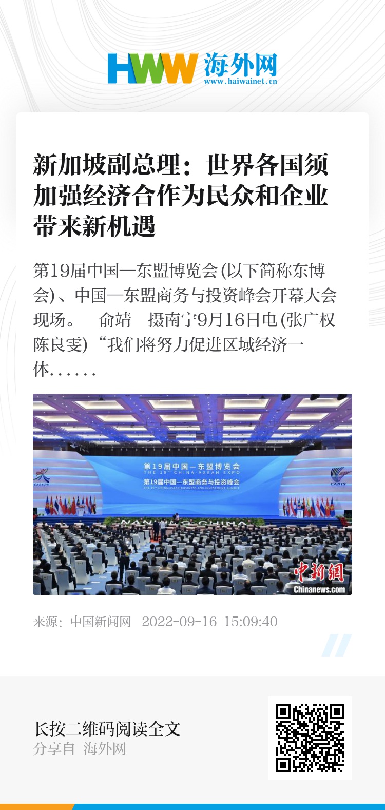 中新网南宁9月16日电(张广权 陈良雯)“我们将努力促进区域经济一体化和经济合作,促进各国经济增长,为民众和企业带来新机遇。”新加坡副总理兼经济政策统筹部长王瑞杰16日表示。