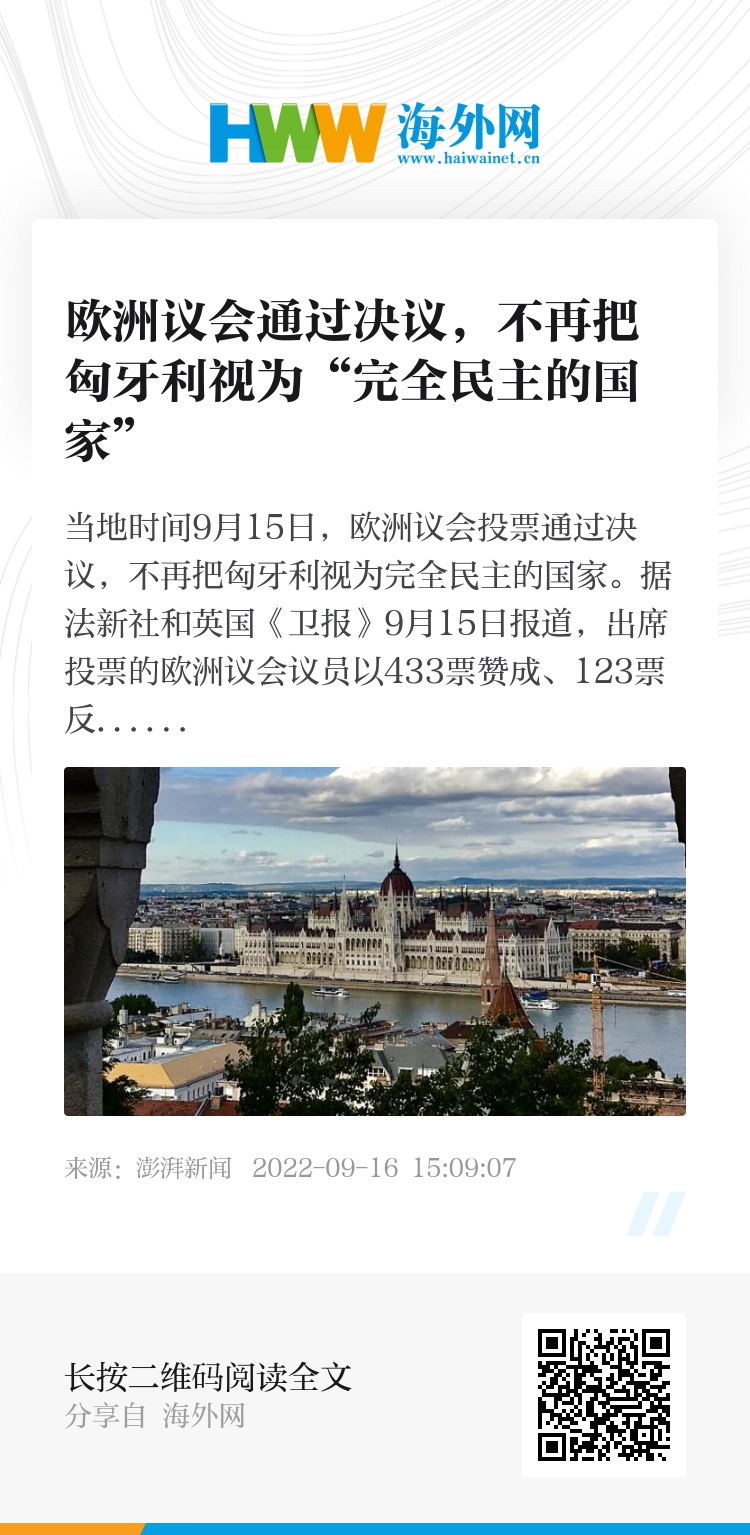 据法新社和英国《卫报》9月15日报道,出席投票的欧洲议会议员以433票赞成、123票反对、28票弃权通过了这项决议,决议称匈牙利目前执政的是“民选独裁的混合政权”,“严重违反”欧盟民主规范。
