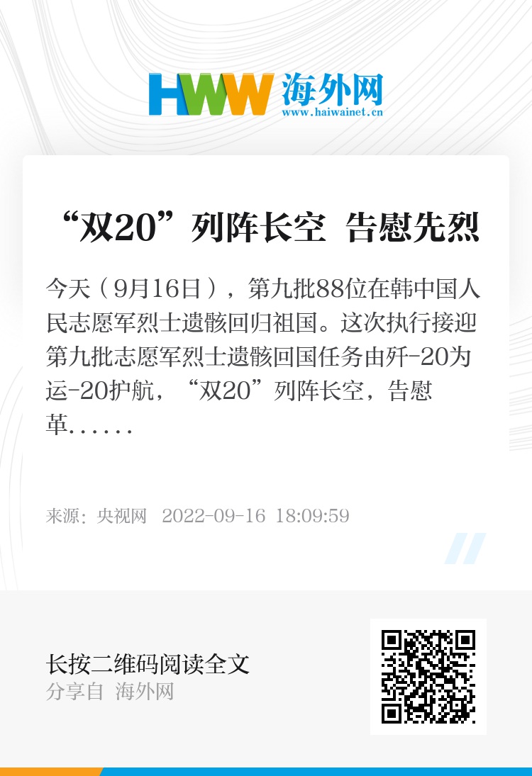 今天(9月16日),第九批88位在韩中国人民志愿军烈士遗骸回归祖国。这次执行接迎第九批志愿军烈士遗骸回国任务由歼-20为运-20护航,“双20”列阵长空,告慰革命先烈。