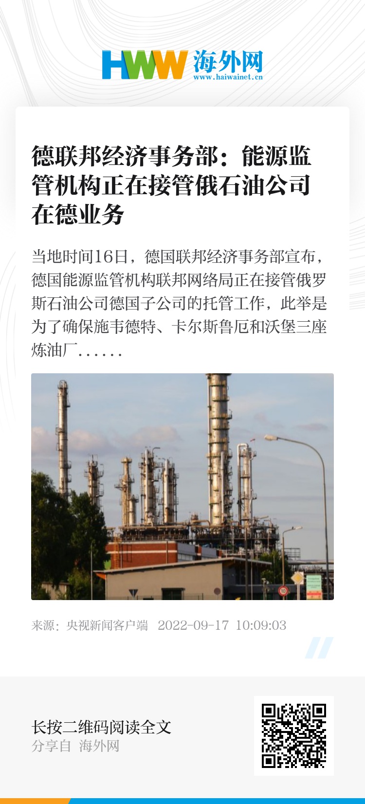 当地时间16日,德国联邦经济事务部宣布,德国能源监管机构联邦网络局正在接管俄罗斯石油公司德国子公司的托管工作,此举是为了确保施韦德特、卡尔斯鲁厄和沃堡三座炼油厂的运营。