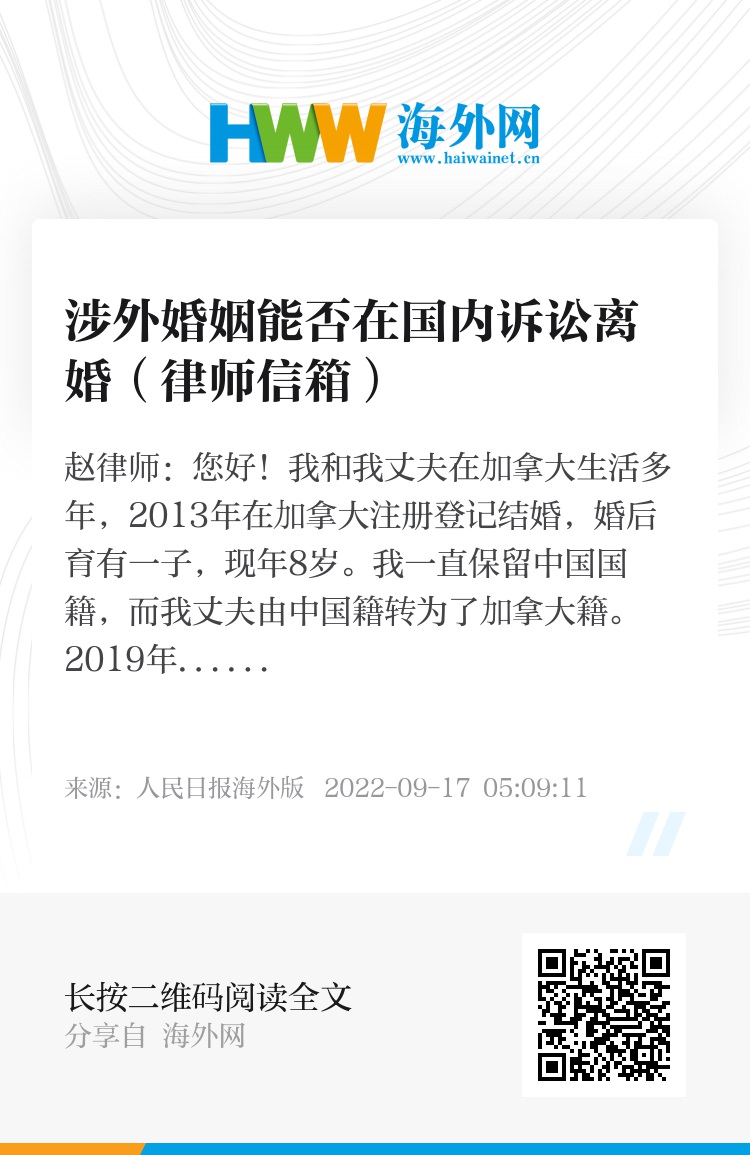 您好!我和我丈夫在加拿大生活多年,2013年在加拿大注册登记结婚,婚后育有一子,现年8岁。我一直保留中国国籍,而我丈夫由中国籍转为了加拿大籍。2019年,我因个人事业发展需要,带孩子回到国内,之后因种种原因就没再回加拿大。现双方长期分居,加上性格不合等原因,我们都有离婚的想法,但我想在中国办理离婚,我丈夫则想在加拿大办理离婚。我的孩子和丈夫均为加拿大国籍,请问我能在中国起诉离婚吗?