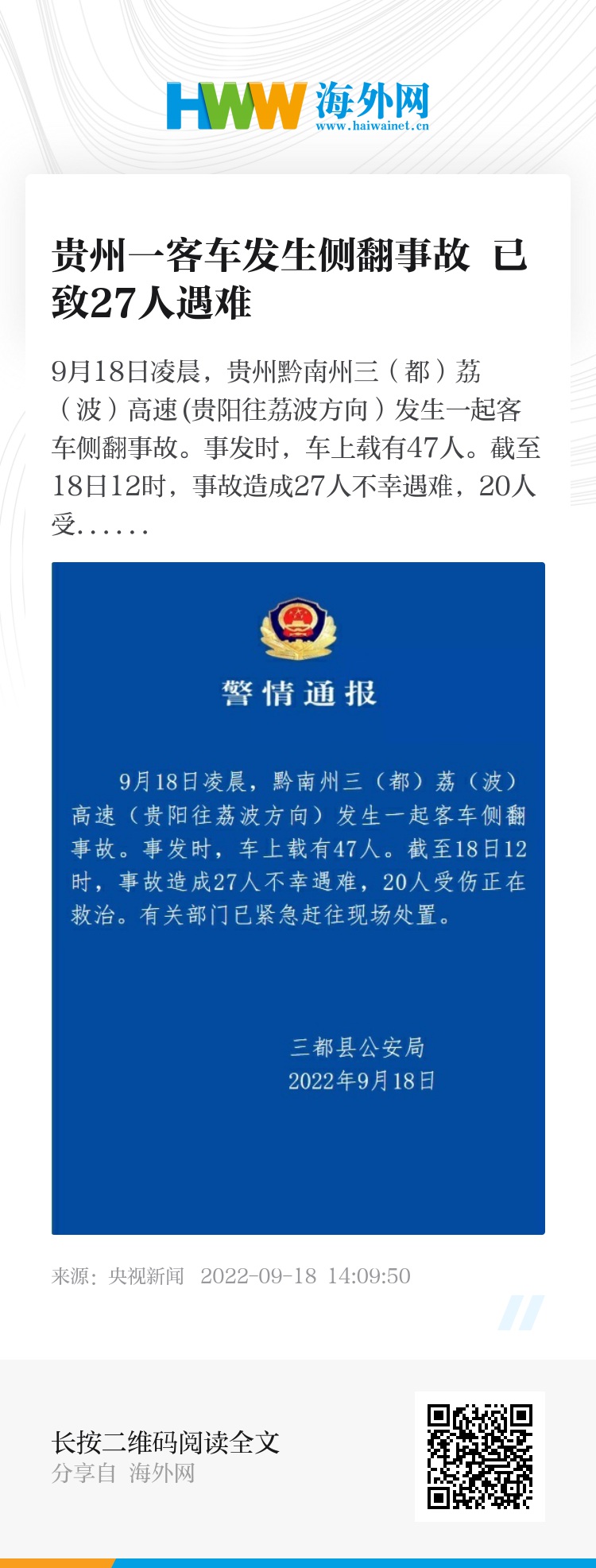 9月18日凌晨,贵州黔南州三(都)荔(波)高速(贵阳往荔波方向)发生一起客车侧翻事故。事发时,车上载有47人。截至18日12时,事故造成27人不幸遇难,20人受伤正在救治。有关部门已紧急赶往现场处置。