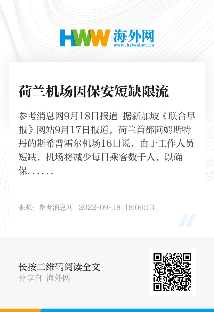 参考消息网9月18日报道 据新加坡《联合早报》网站9月17日报道,荷兰首都阿姆斯特丹的斯希普霍尔机场16日说,由于工作人员短缺,机场将减少每日乘客数千人,以确保运作顺畅。