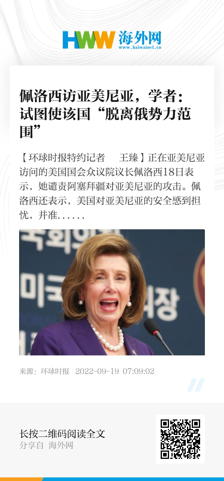 【环球时报特约记者 王臻】正在亚美尼亚访问的美国国会众议院议长佩洛西18日表示,她谴责阿塞拜疆对亚美尼亚的攻击。佩洛西还表示,美国对亚美尼亚的安全感到担忧,并准备提供协助。