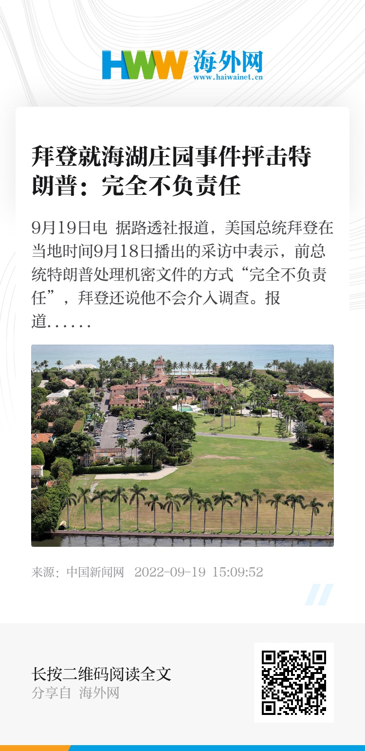 报道称,拜登在接受哥伦比亚广播公司《60分钟》节目采访时说,看到联邦调查局(FBI)8月8日搜查特朗普的海湖庄园时发现的机密文件,他不禁怀疑“怎么会有人这么不负责任”。