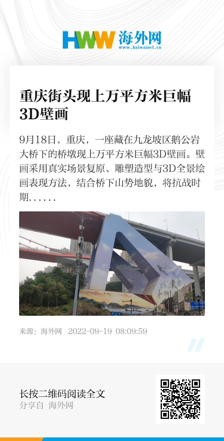 9月18日,重庆,一座藏在九龙坡区鹅公岩大桥下的桥墩现上万平方米巨幅3D壁画。壁画采用真实场景复原、雕塑造型与3D全景绘画表现方法,结合桥下山势地貌,将抗战时期兵工厂的场景完美展现出来。图片来源:视觉中国