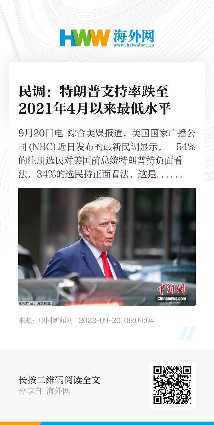 中新网9月20日电 综合美媒报道,美国国家广播公司(NBC)近日发布的最新民调显示, 54%的注册选民对美国前总统特朗普持负面看法,34%的选民持正面看法,这是自2021年4月以来的最低值。