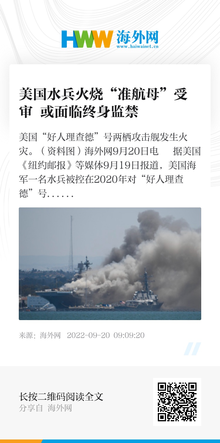 海外网9月20日电 据美国《纽约邮报》等媒体9月19日报道,美国海军一名水兵被控在2020年对“好人理查德”号两栖攻击舰纵火,他将于本星期开始出庭受审。如果罪名成立,他将面临终身监禁。