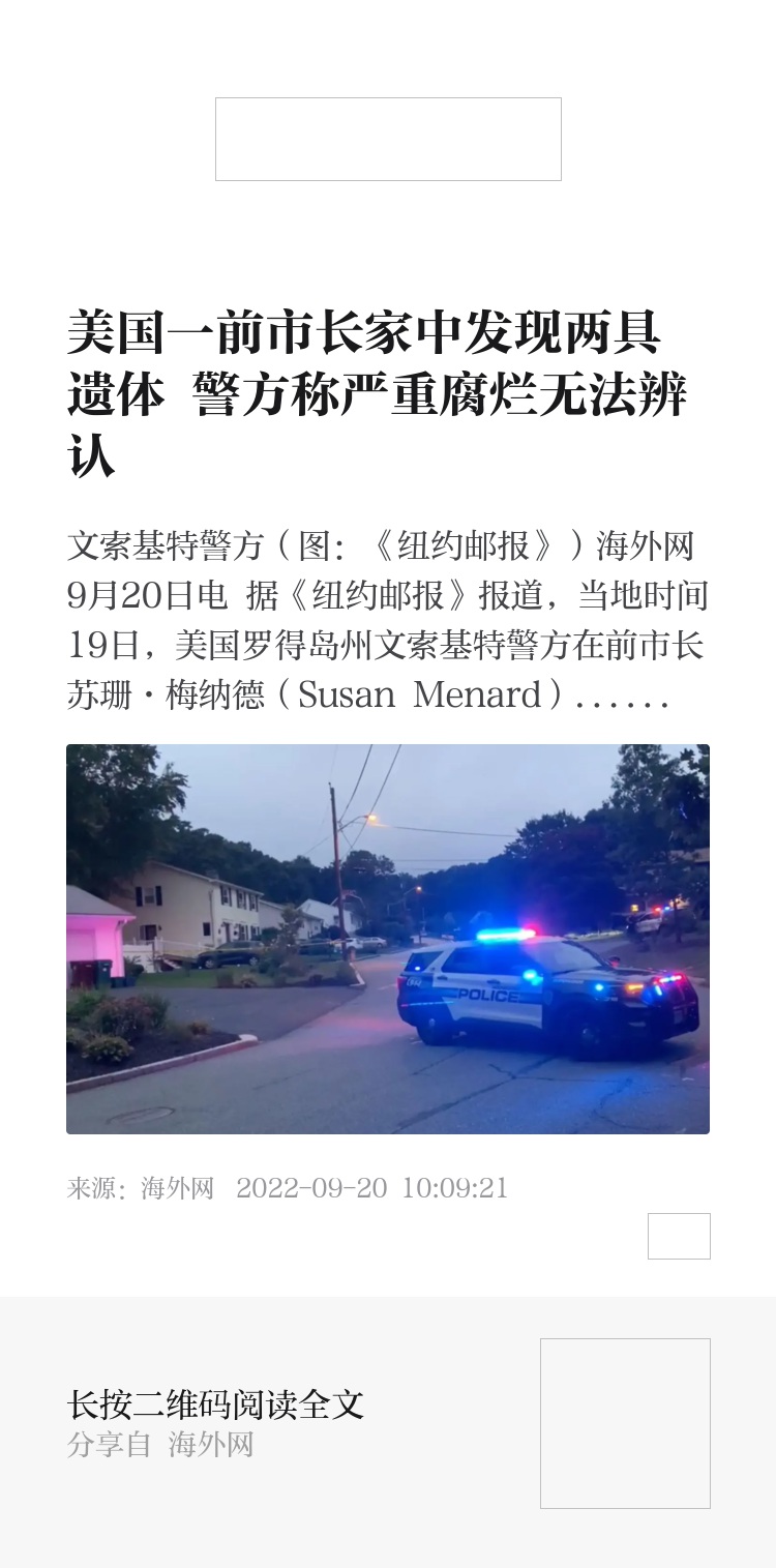 海外网9月20日电 据《纽约邮报》报道,当地时间19日,美国罗得岛州文索基特警方在前市长苏珊·梅纳德(Susan Menard)的家中发现两具遗体,遗体严重腐烂已无法辨认。