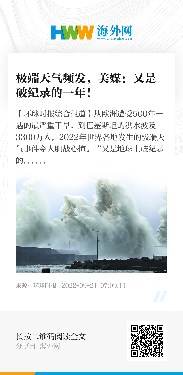 【环球时报综合报道】从欧洲遭受500年一遇的最严重干旱,到巴基斯坦的洪水波及3300万人,2022年世界各地发生的极端天气事件令人胆战心惊。“又是地球上破纪录的一年。”美国《一周》周刊网站刊文说,今年的天气非常恶劣,有时甚至难以预测。世界天气归因组织表示,如果没有气候变化,罕见的高温和干旱情况“极不可能”发生,同样的道理也适用于越来越常见的倾盆大雨。