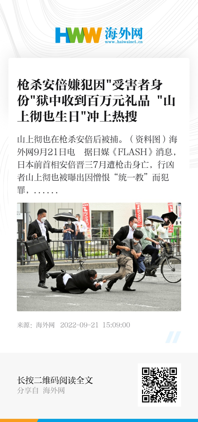 海外网9月21日电 据日媒《FLASH》消息,日本前首相安倍晋三7月遭枪击身亡,行凶者山上彻也被曝出因憎恨“统一教”而犯罪,其经历引发部分日本民众同情。山上在狱中已收到民众寄去的现金、衣服、书籍等,总价值超百万日元。