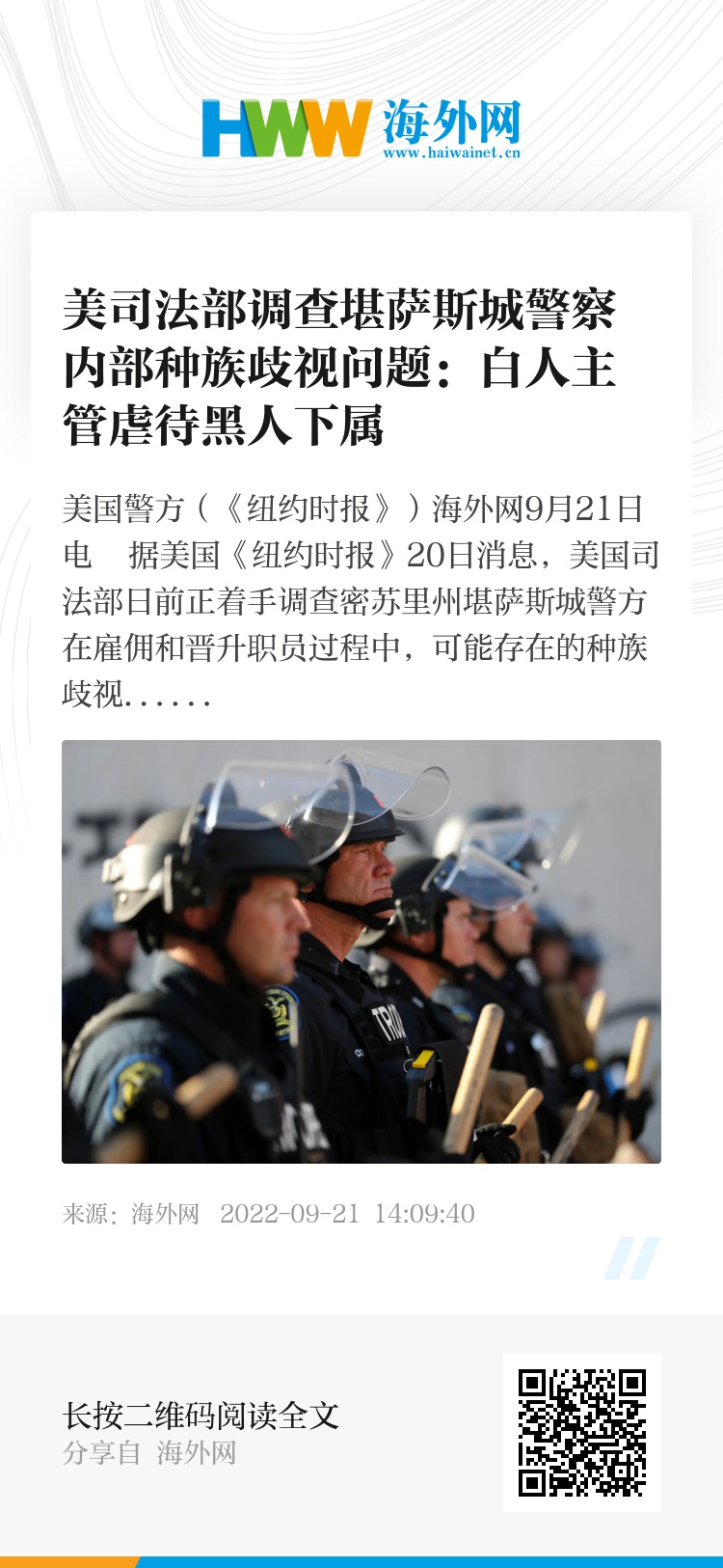 海外网9月21日电 据美国《纽约时报》20日消息,美国司法部日前正着手调查密苏里州堪萨斯城警方在雇佣和晋升职员过程中,可能存在的种族歧视问题。