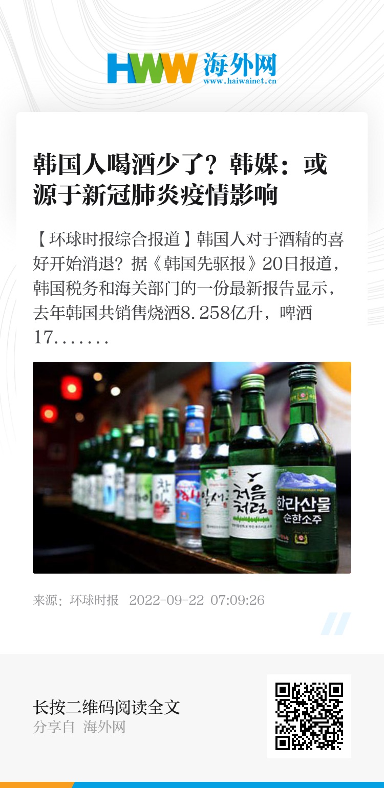 报道称,这种减少或许源于新冠肺炎疫情的影响,疫情使人们不愿在下班后进行社交和聚会。不过,韩国葡萄酒的进口量倒是翻了一番,从2017年的3650万升增至2021年的7680万升。有专家认为,这一现象反映了韩国聚会文化和酒精消费趋势的变化,“世界卫生组织估计,饮酒是造成每年200多种疾病和3300万人死亡的主要原因,政府应继续完善相关政策,以更好地管理酒精消费”。(白 晓)