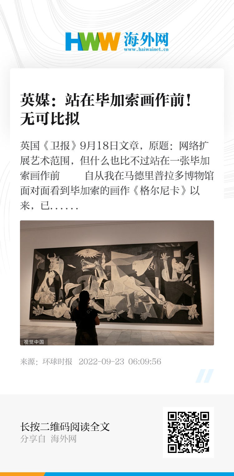 英国《卫报》9月18日文章,原题:网络扩展艺术范围,但什么也比不过站在一张毕加索画作前 自从我在马德里普拉多博物馆面对面看到毕加索的画作《格尔尼卡》以来,已经过去30多年。1937年,为强烈抗议德国在西班牙内战期间轰炸巴斯克小镇格尔尼卡,毕加索绘制了这幅画。我曾看过这幅名画的数十种图像,但它们都没有让我为站在它面前做好准备。