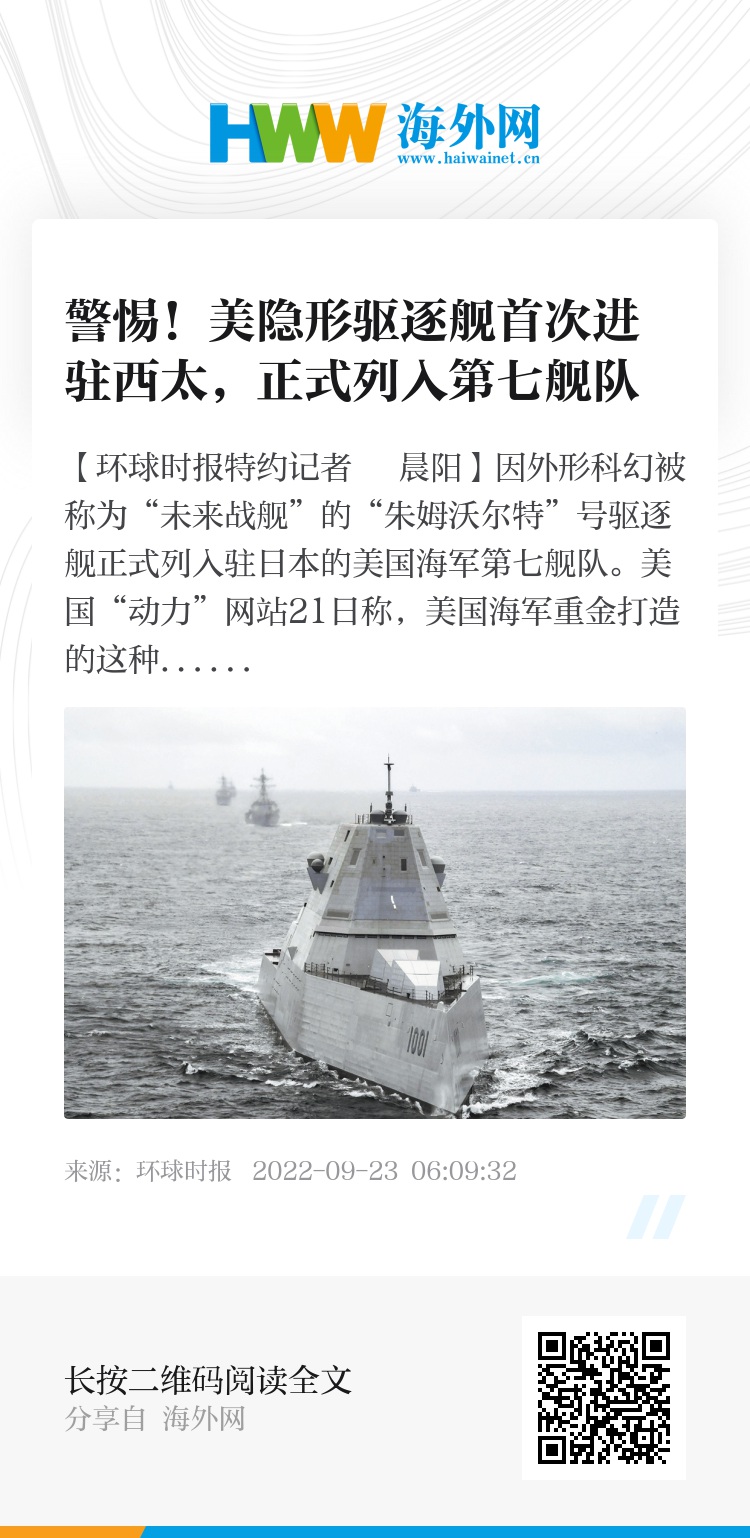 【环球时报特约记者 晨阳】因外形科幻被称为“未来战舰”的“朱姆沃尔特”号驱逐舰正式列入驻日本的美国海军第七舰队。美国“动力”网站21日称,美国海军重金打造的这种隐形驱逐舰首次海外部署就选择亚太区域,足见对该地区的重视。专家分析称,美国海军将“朱姆沃尔特”号部署在西太平洋地区,不仅是要加强该地区的军事部署,同时也有意摸索这种隐形驱逐舰的特殊作战模式。