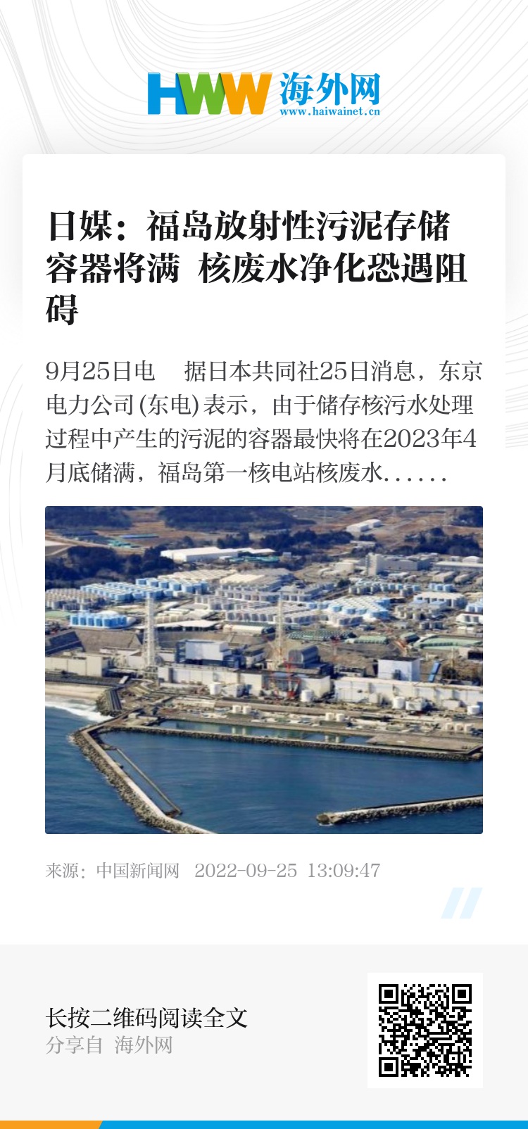 中新网9月25日电 据日本共同社25日消息,东京电力公司(东电)表示,由于储存核污水处理过程中产生的污泥的容器最快将在2023年4月底储满,福岛第一核电站核废水处理工作可能面临阻碍。