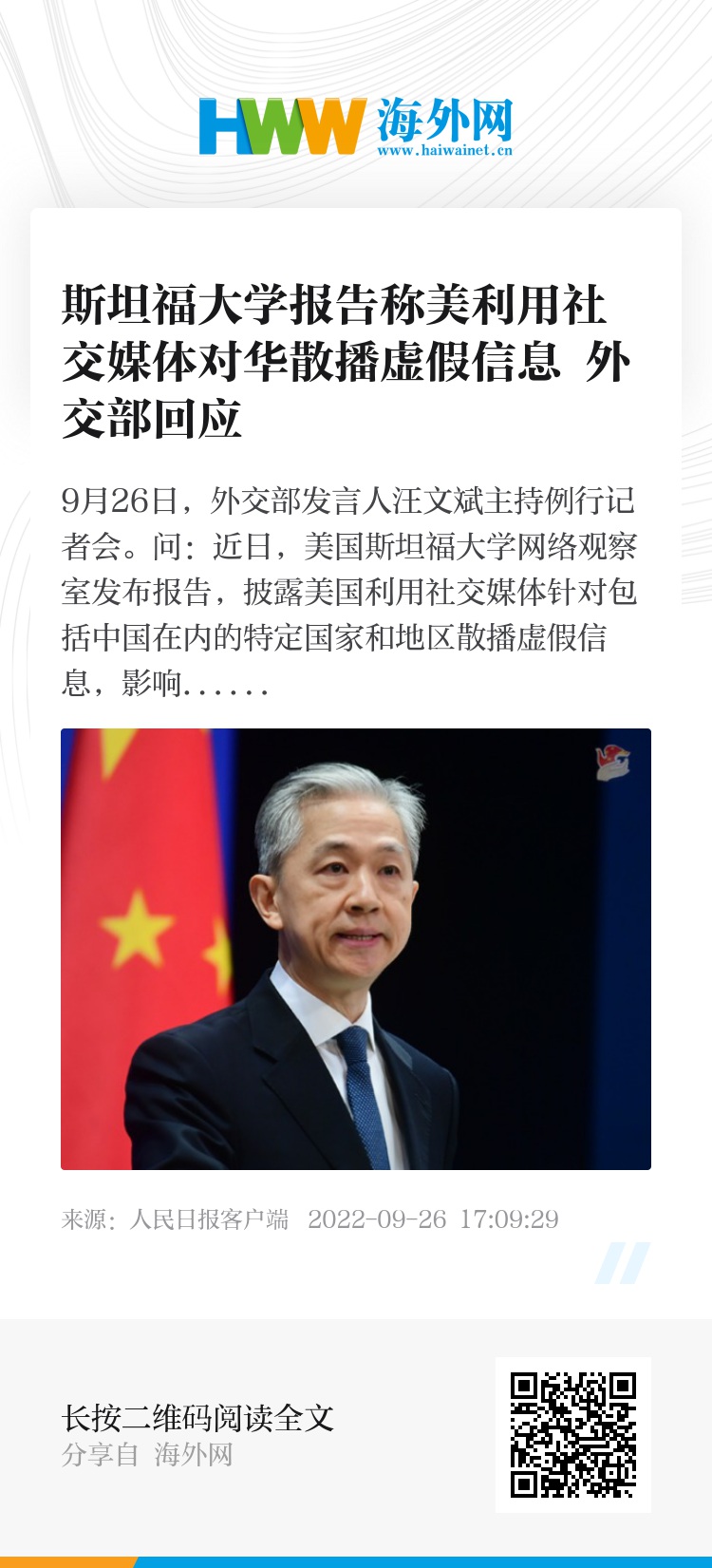问:近日,美国斯坦福大学网络观察室发布报告,披露美国利用社交媒体针对包括中国在内的特定国家和地区散播虚假信息,影响国际舆论,操纵认知叙事,请问中方对此有何评论?