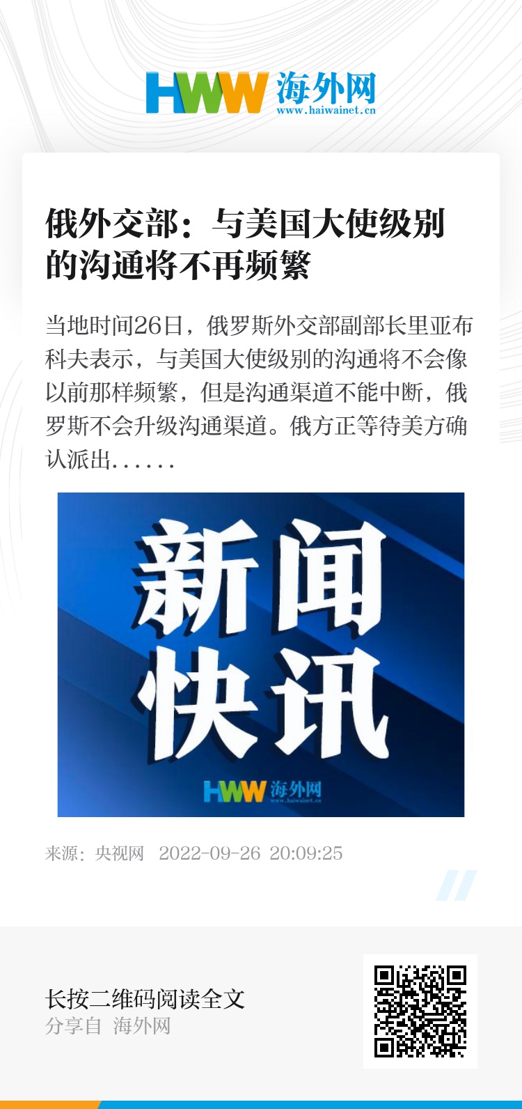 当地时间26日,俄罗斯外交部副部长里亚布科夫表示,与美国大使级别的沟通将不会像以前那样频繁,但是沟通渠道不能中断,俄罗斯不会升级沟通渠道。俄方正等待美方确认派出新的驻俄大使。(总台记者 张誉耀)
