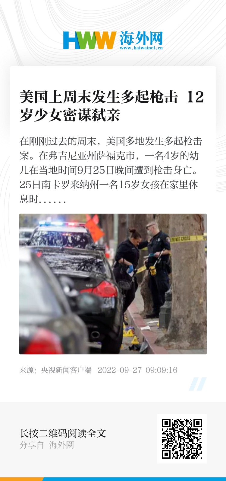 另外在近日,得克萨斯州一名12岁女孩先是开枪击中自己的父亲,随后试图开枪自杀,两人均被送往医院就医,目前尚不清楚伤情。当地警方表示,这名女孩和另外一名未成年人女孩已提前数周计划杀害各自家庭成员及宠物,随后开枪自杀,然而另一名女孩并未按照计划行动。