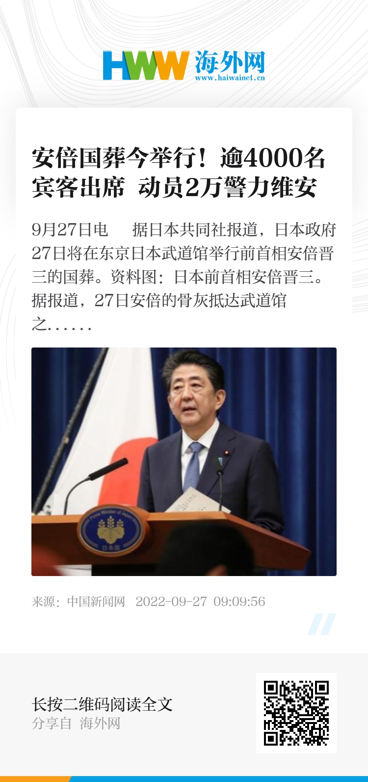 中新网9月27日电 据日本共同社报道,日本政府27日将在东京日本武道馆举行前首相安倍晋三的国葬。