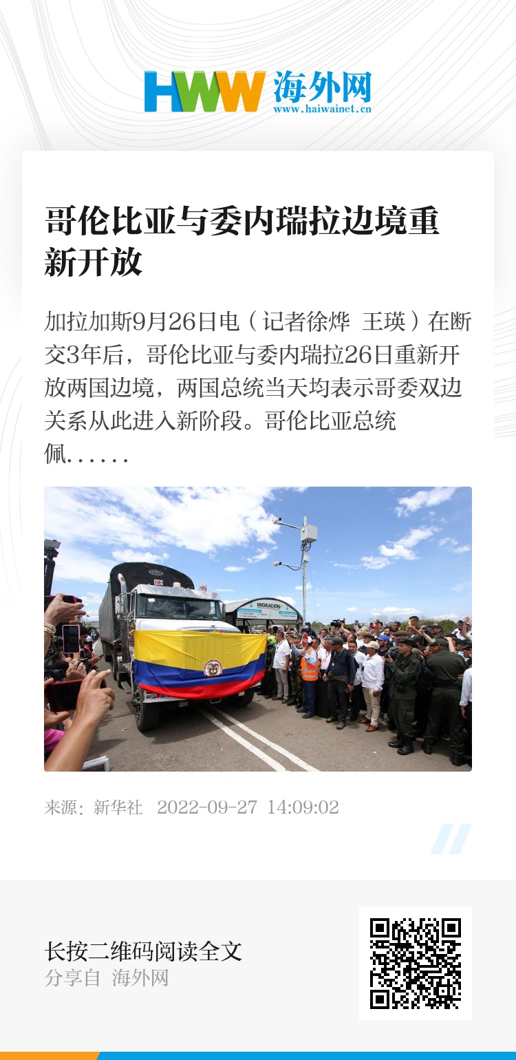 新华社加拉加斯9月26日电(记者徐烨 王瑛)在断交3年后,哥伦比亚与委内瑞拉26日重新开放两国边境,两国总统当天均表示哥委双边关系从此进入新阶段。