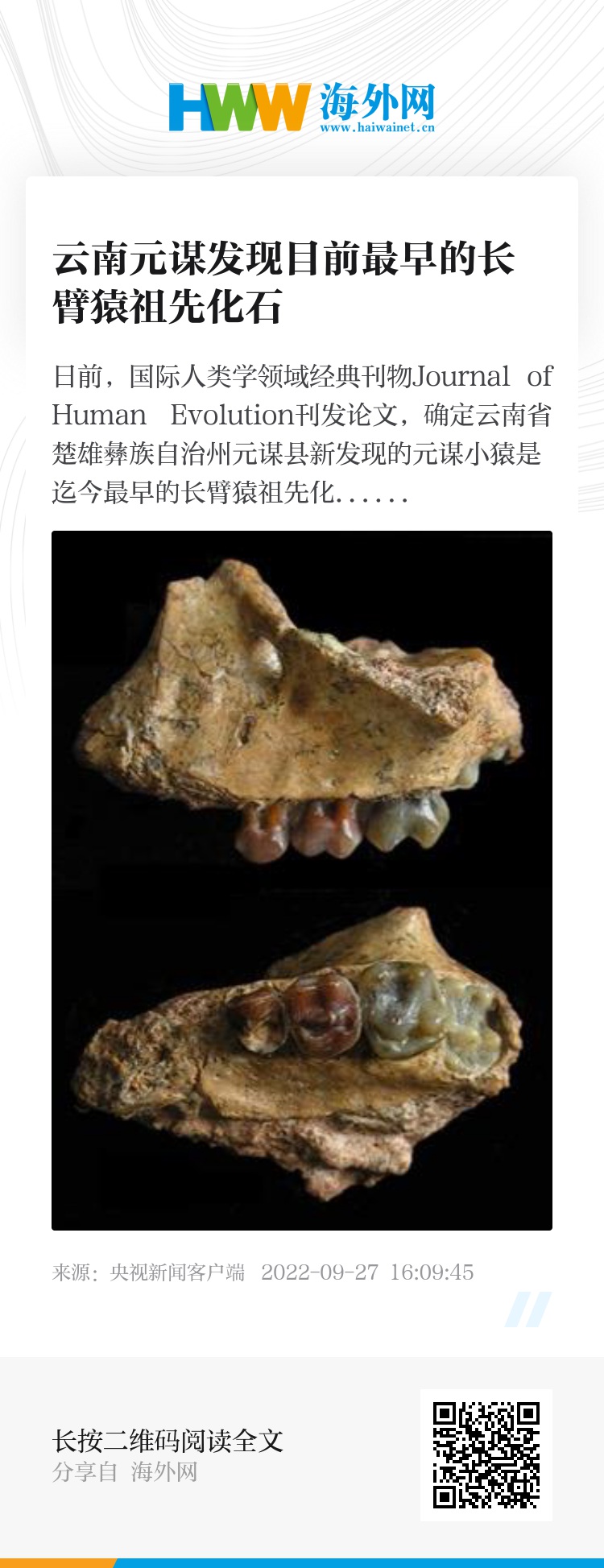 日前,国际人类学领域经典刊物Journal of Human Evolution刊发论文,确定云南省楚雄彝族自治州元谋县新发现的元谋小猿是迄今最早的长臂猿祖先化石。这一发现将长臂猿化石记录向前推至距今700万—800万年前。