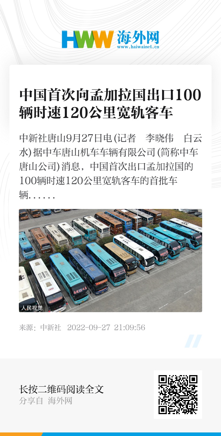 中新社唐山9月27日电(记者 李晓伟 白云水)据中车唐山机车车辆有限公司(简称中车唐山公司)消息,中国首次出口孟加拉国的100辆时速120公里宽轨客车的首批车辆,27日在河北唐山下线。