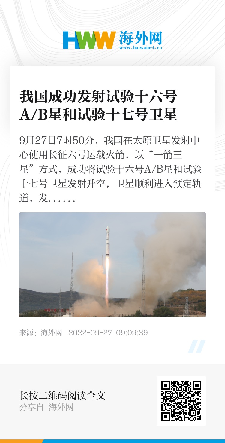 9月27日7时50分,我国在太原卫星发射中心使用长征六号运载火箭,以“一箭三星”方式,成功将试验十六号A/B星和试验十七号卫星发射升空,卫星顺利进入预定轨道,发射任务获得圆满成功。该组卫星主要用于国土普查、城市规划和防灾减灾等领域。来源:视觉中国