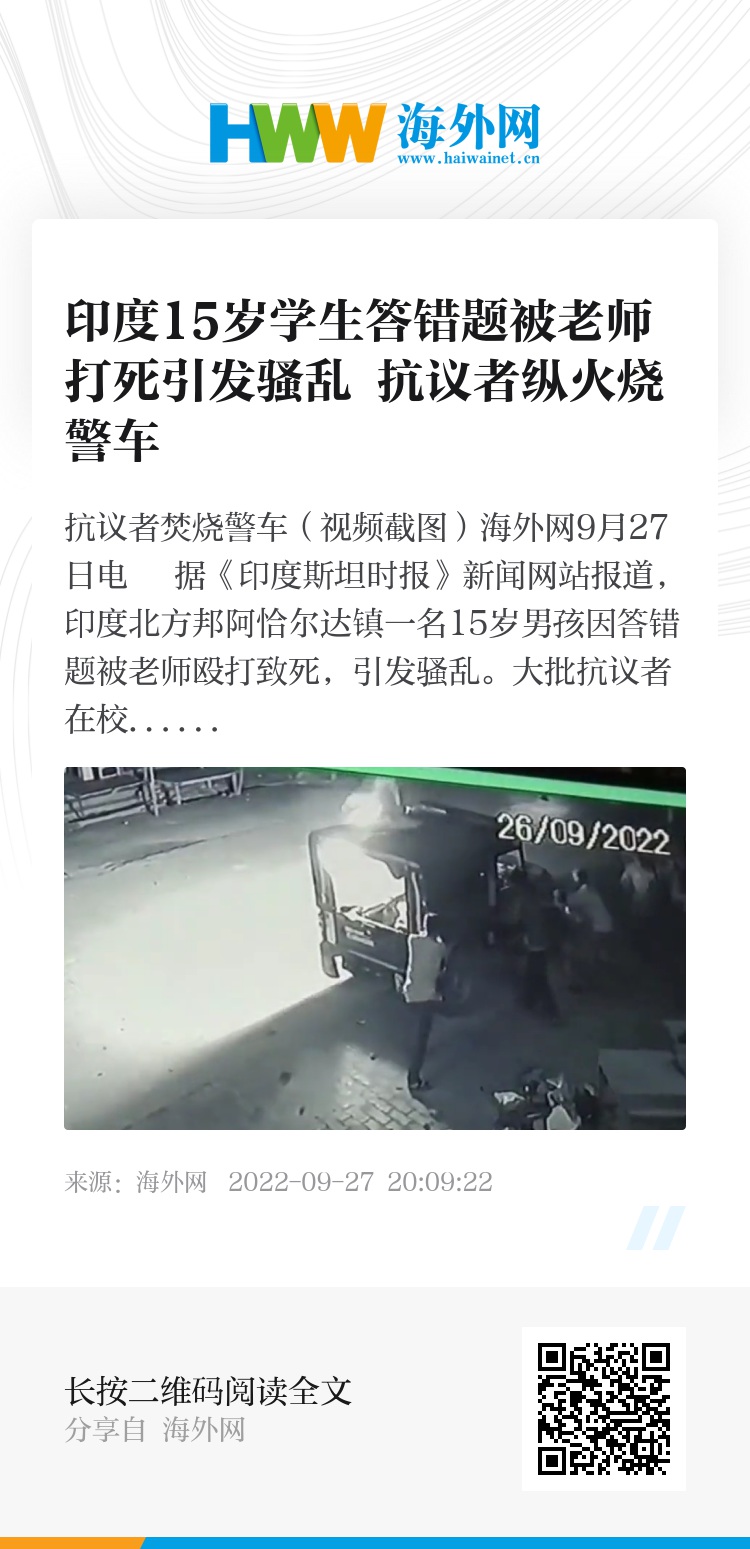 海外网9月27日电 据《印度斯坦时报》新闻网站报道,印度北方邦阿恰尔达镇一名15岁男孩因答错题被老师殴打致死,引发骚乱。大批抗议者在校门口纵火,焚烧警方车辆。