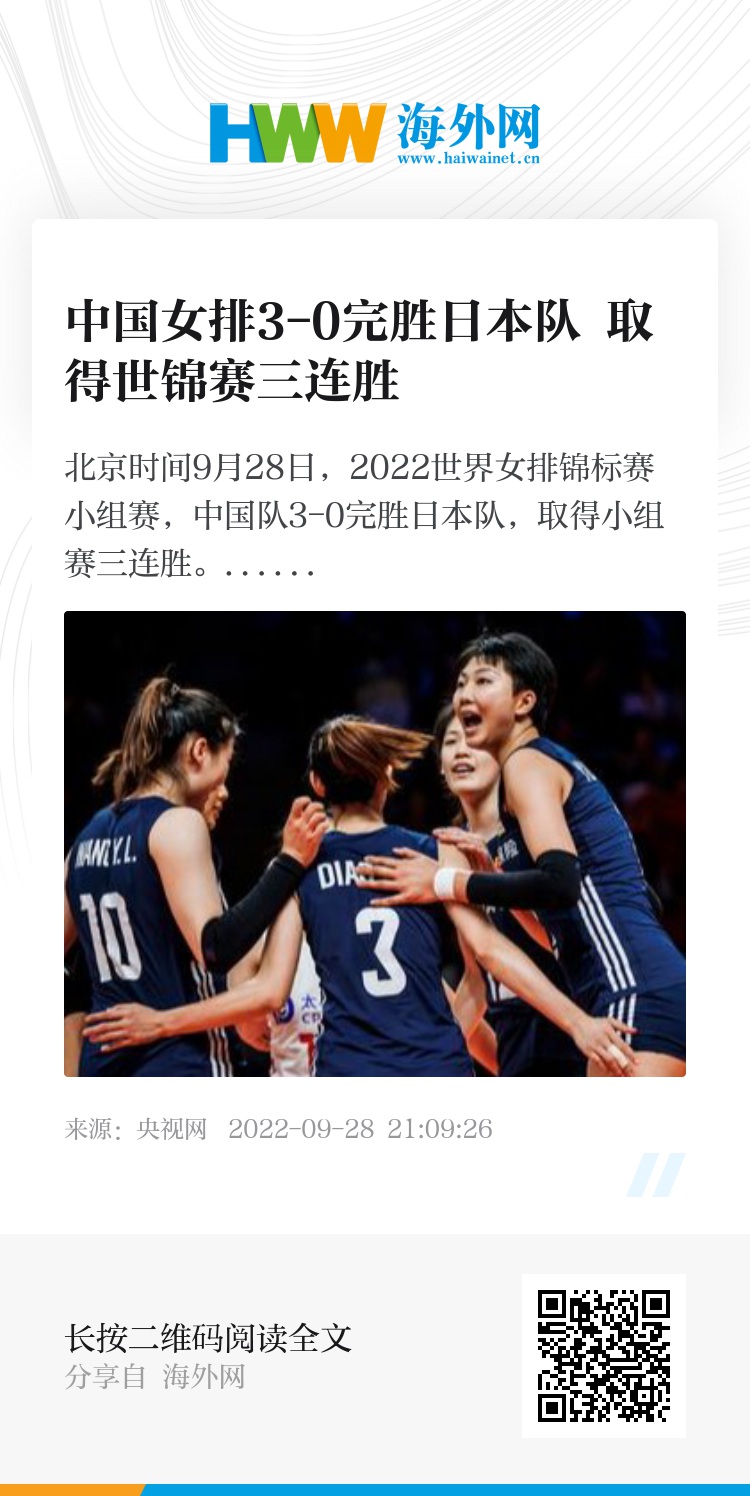 北京时间9月28日,2022世界女排锦标赛小组赛,中国队3-0完胜日本队,取得小组赛三连胜。