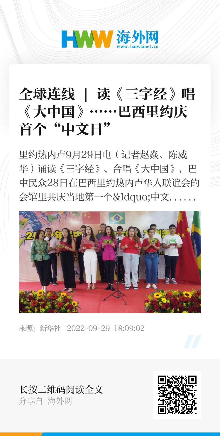 新华社里约热内卢9月29日电(记者赵焱、陈威华)诵读《三字经》、合唱《大中国》,巴中民众28日在巴西里约热内卢华人联谊会的会馆里共庆当地第一个“中文日”。