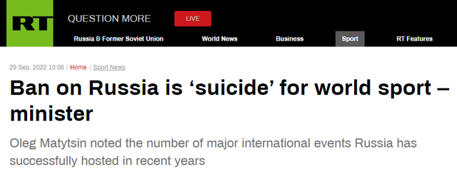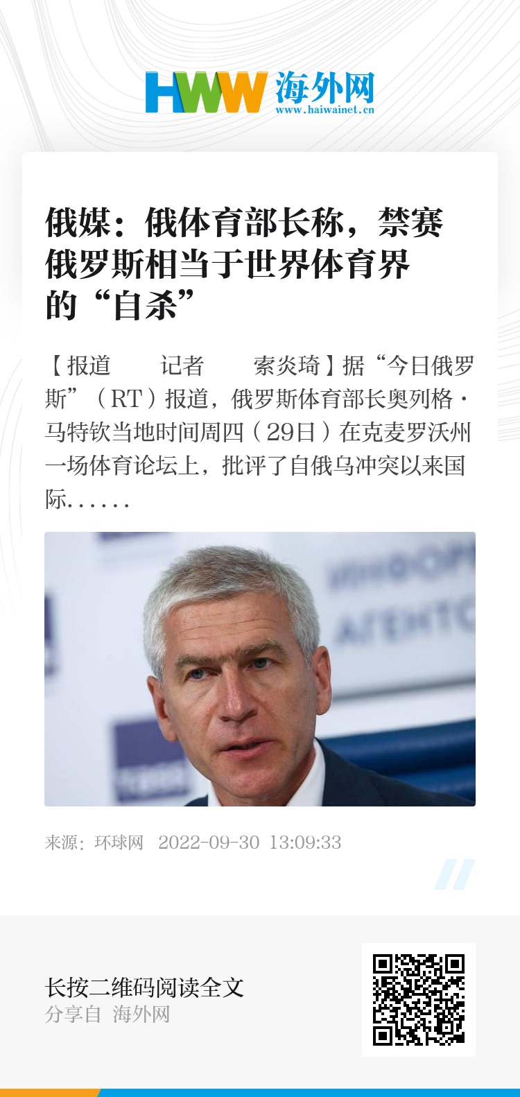 【环球网报道 记者 索炎琦】据“今日俄罗斯”(RT)报道,俄罗斯体育部长奥列格·马特钦当地时间周四(29日)在克麦罗沃州一场体育论坛上,批评了自俄乌冲突以来国际层面对俄罗斯体坛实施的全面制裁,称禁赛俄罗斯已对世界范围体育运动造成伤害,而这相当于“自杀”。