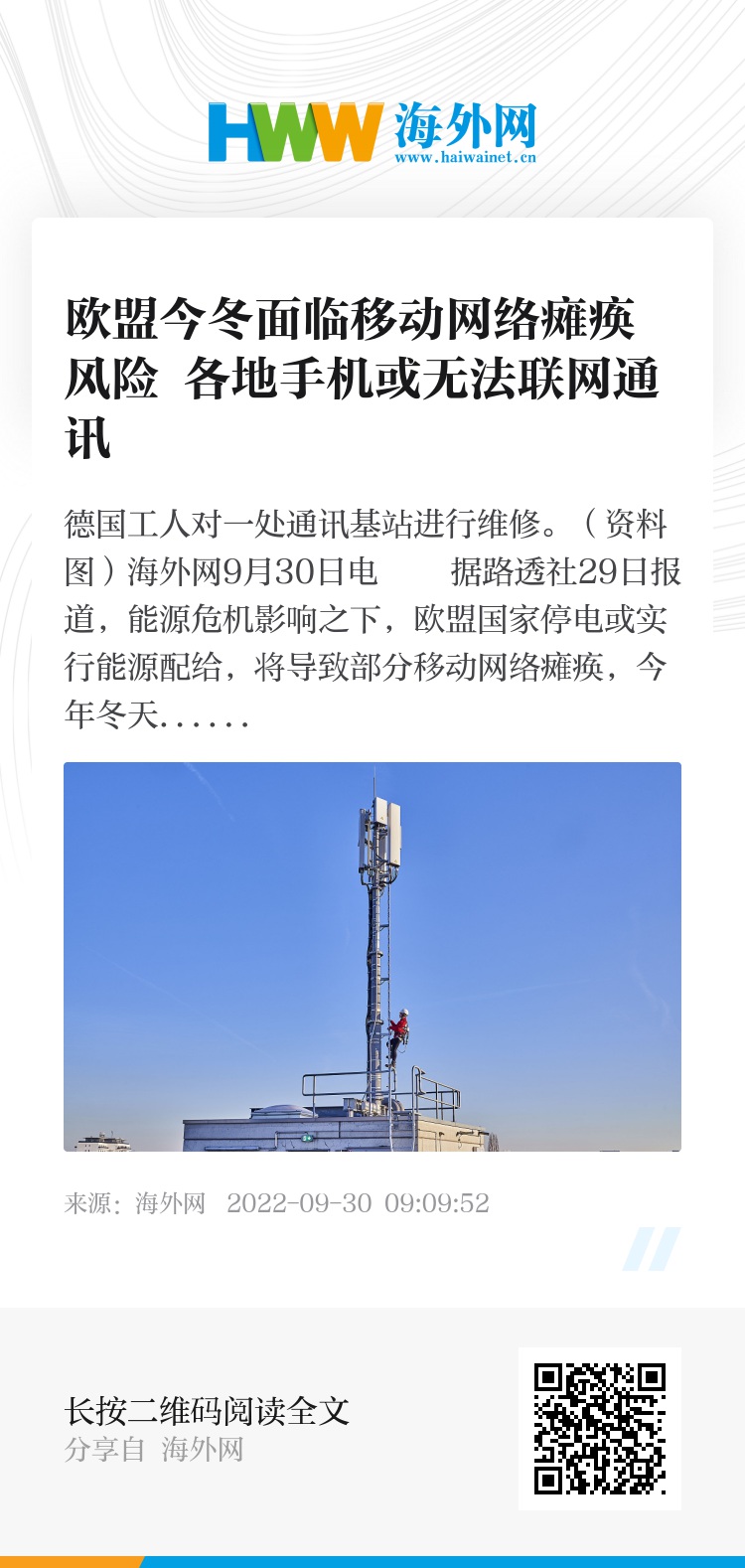海外网9月30日电 据路透社29日报道,能源危机影响之下,欧盟国家停电或实行能源配给,将导致部分移动网络瘫痪,今年冬天欧洲各地的手机可能无法联网通讯。
