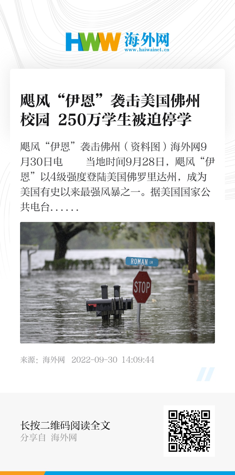 海外网9月30日电 当地时间9月28日,飓风“伊恩”以4级强度登陆美国佛罗里达州,成为美国有史以来最强风暴之一。据美国国家公共电台29日报道,受风暴影响,佛州超过250万学生被迫停学。