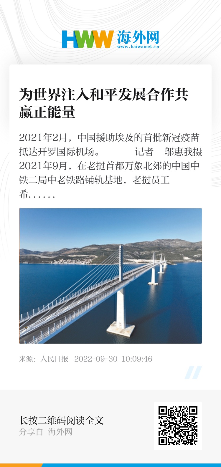 为让和平的阳光普照大地,中国蓝盔部队常年坚守任务区,以优异表现荣获联合国“和平勋章”;为促进共同发展,中国与140多个国家携手共建“一带一路”,不断收获增进人民福祉的累累硕果;为抗击世纪疫情,中国秉承“天下一家”的理念,不仅对中国人民生命安全和身体健康负责,也对全球公共卫生事业尽责;为应对气候变化,中国推动《巴黎协定》达成、签署、生效和实施,立志实现全球最高碳排放强度降幅、用全球历史上最短时间实现从碳达峰到碳中和……新时代的中国坚持胸怀天下、立己达人,不断为世界注入和平发展、合作共赢的正能量。